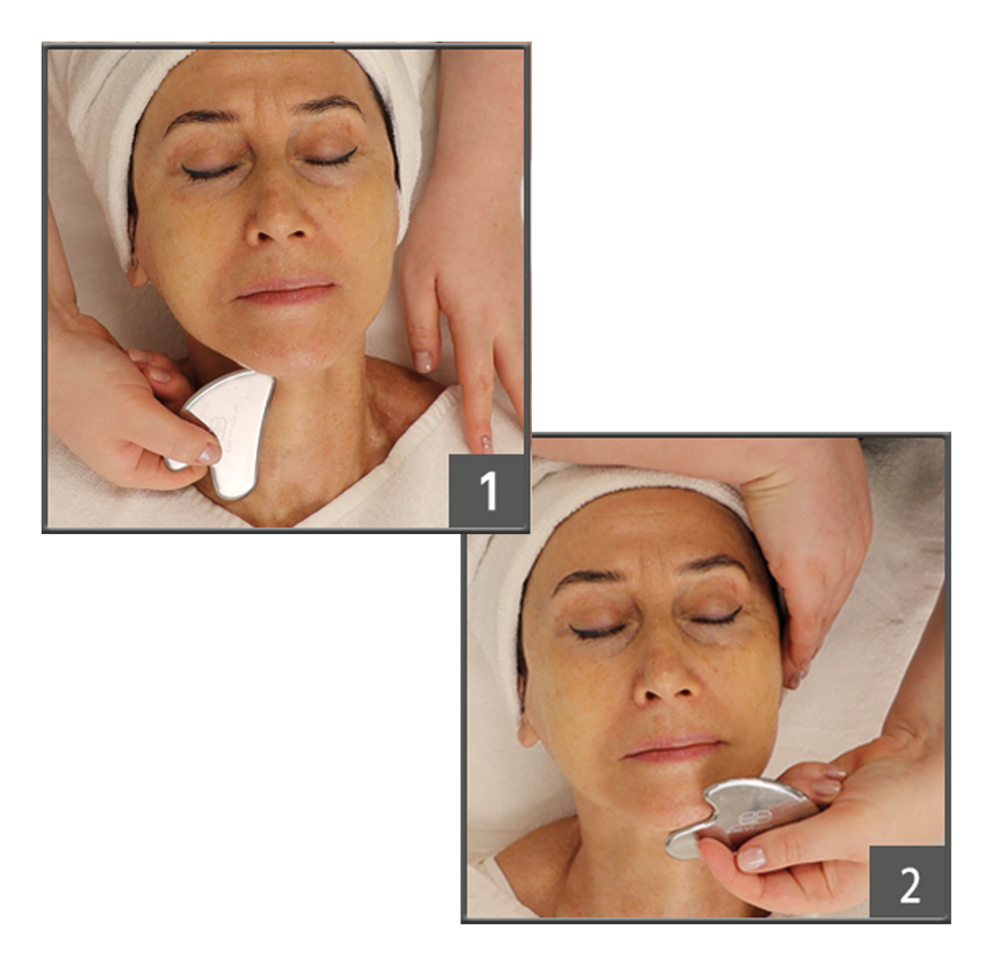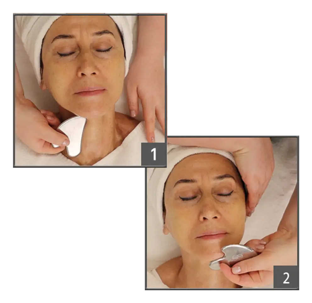 Weiter geht’s mit dem BIPHASIC GUA SHA Treatment um den Mund- und Ohrbereich mit kurzen Auf- und Abbewegungen.