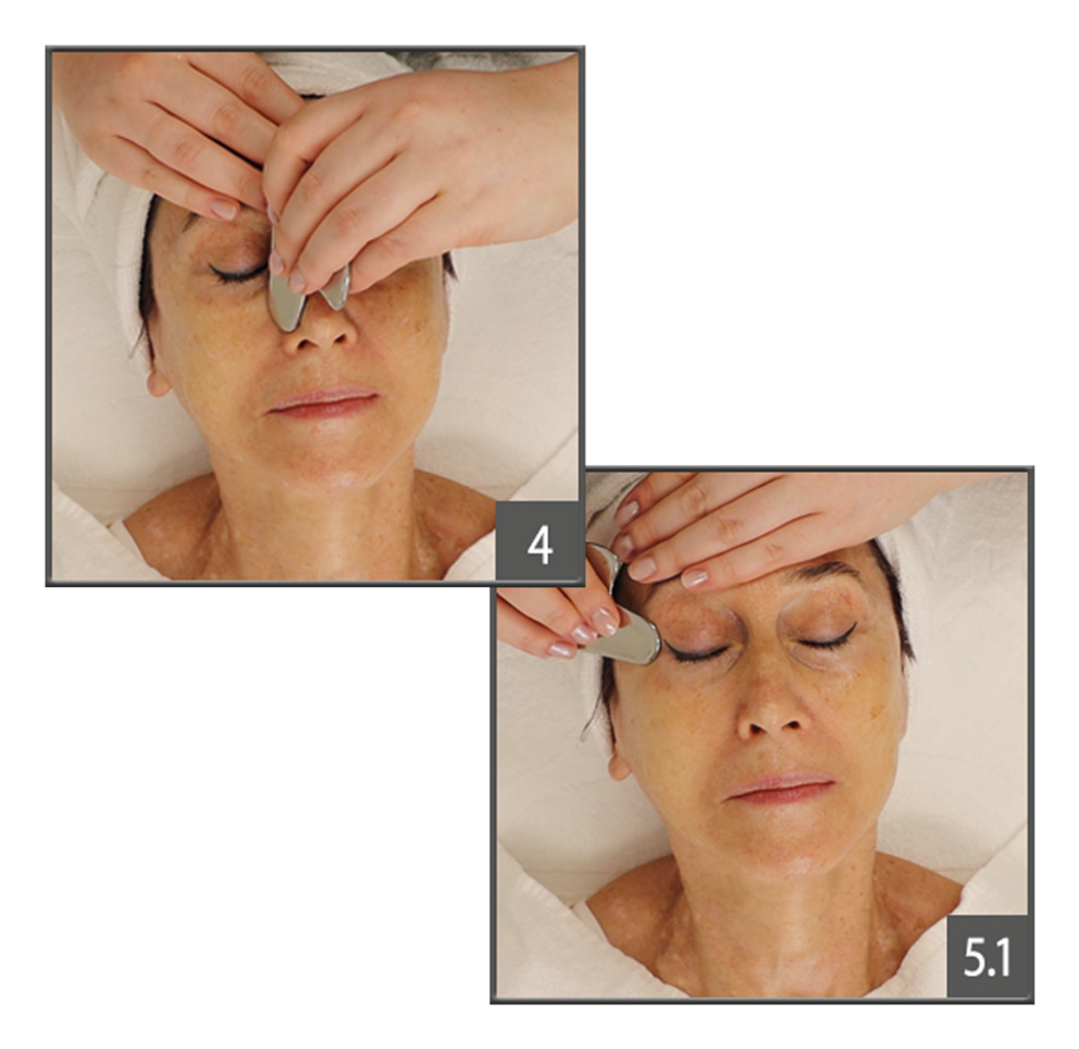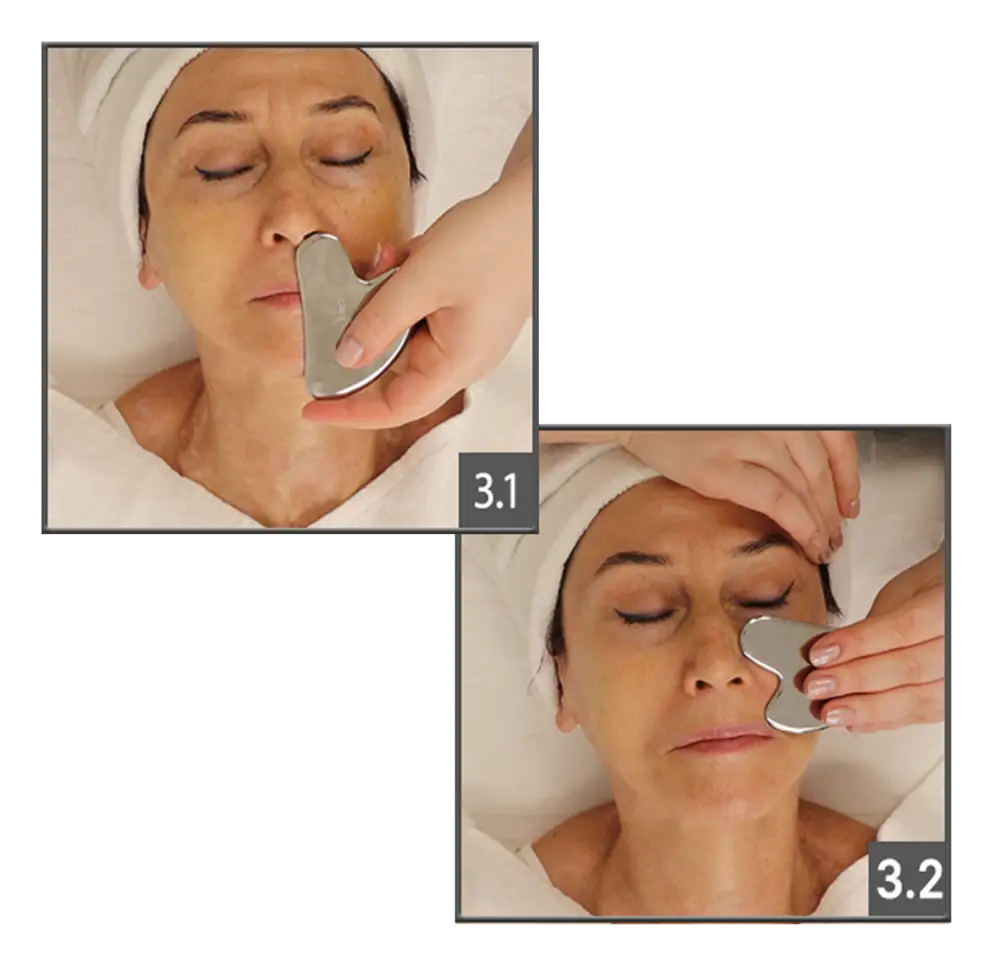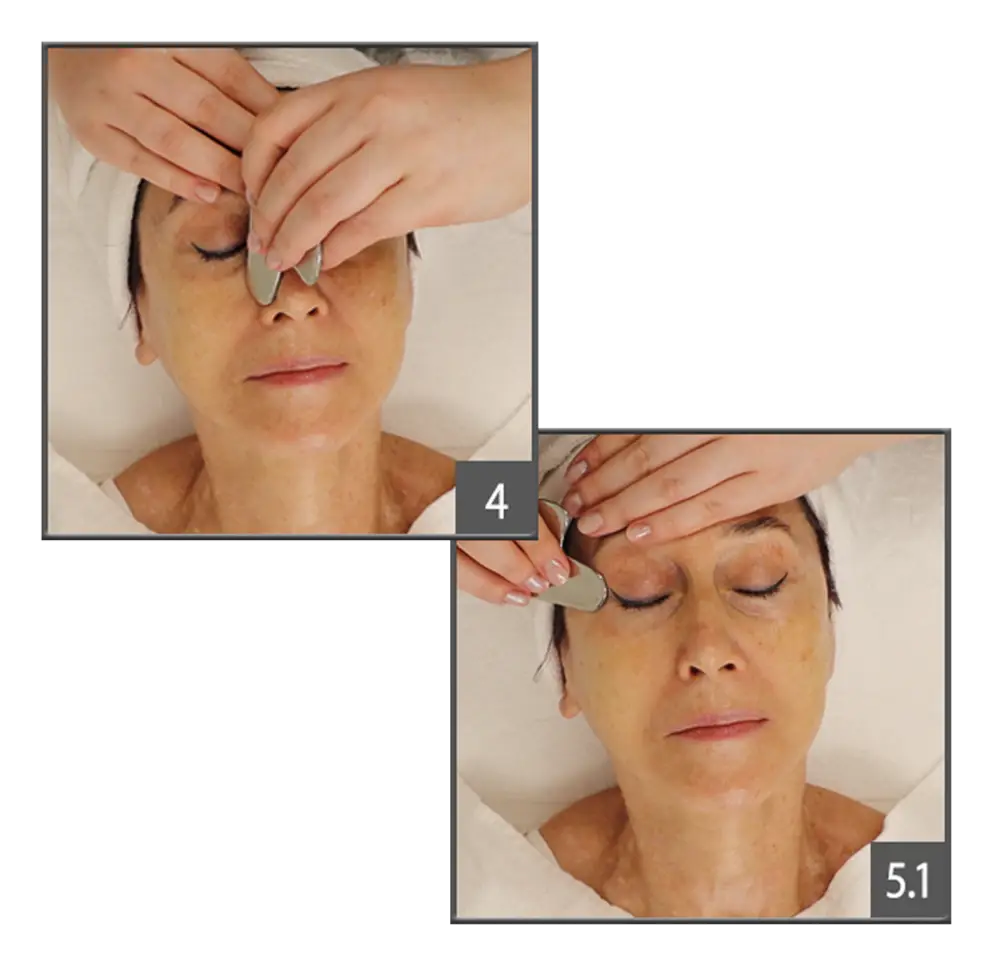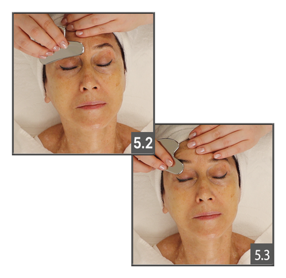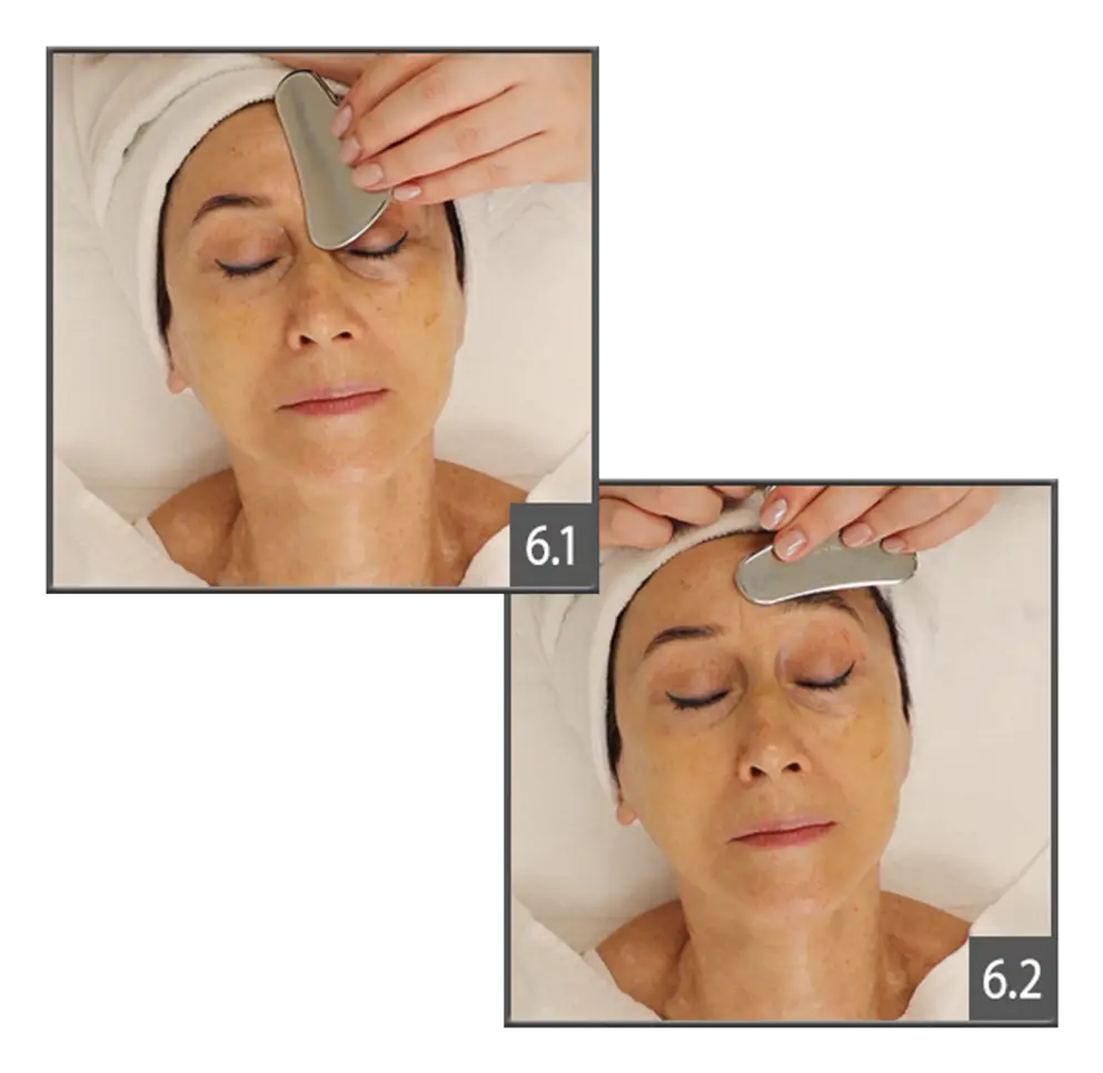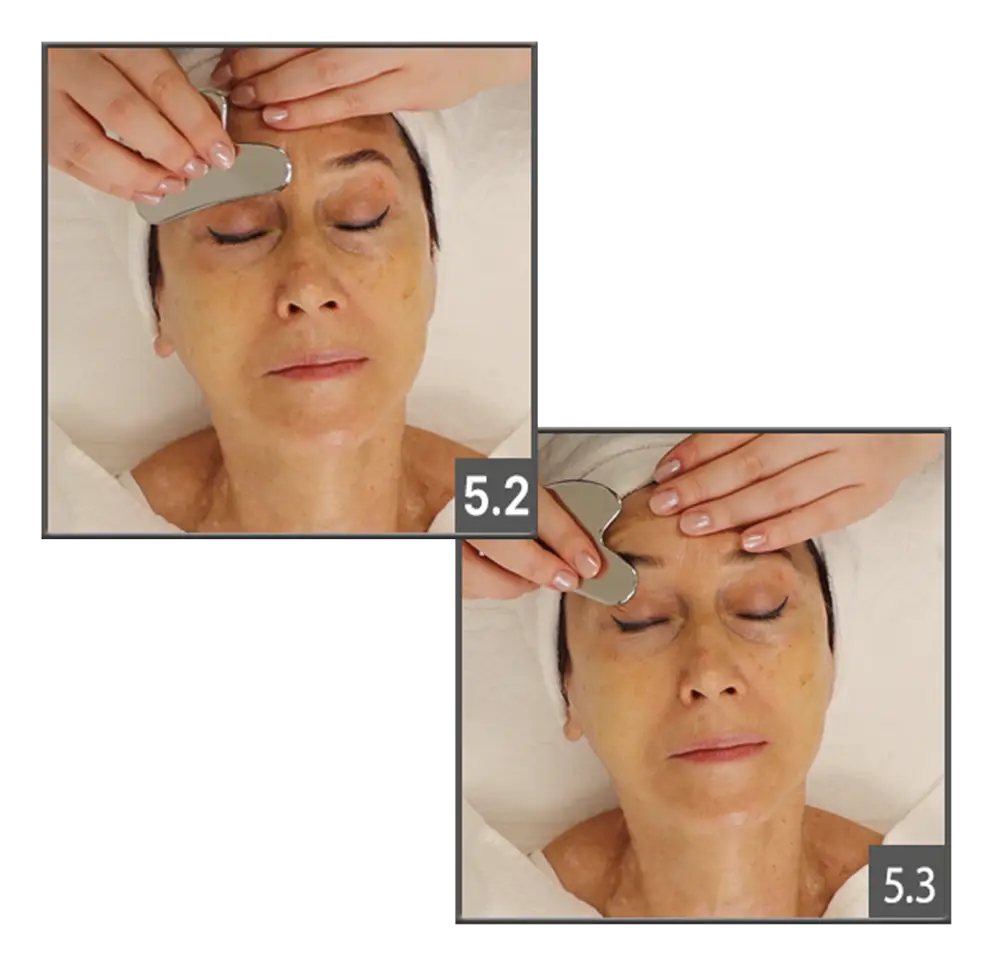 Das sanfte schieben des GUA SHA Tools über die Stirnpartie nach aussen Richtung Haaransatz und Schläfen fördert nun verstärkt den Lifting-Effekt und entspannt die Gesichtsmuskulatur. Anschliessend von den Augenbrauen nach oben zum Haaransatz – jede Wiederholung (bis zu 7mal) unterstreicht im wahrsten Sinne des Wortes den Lifting-Effekt.